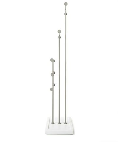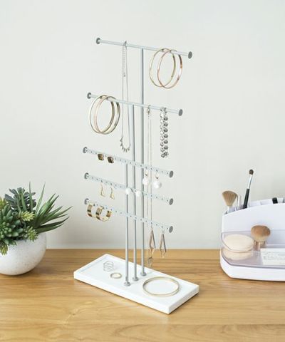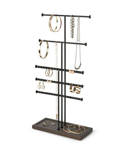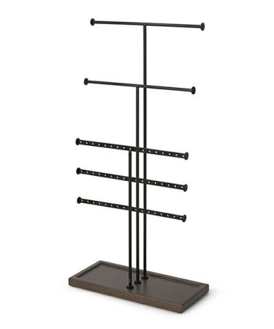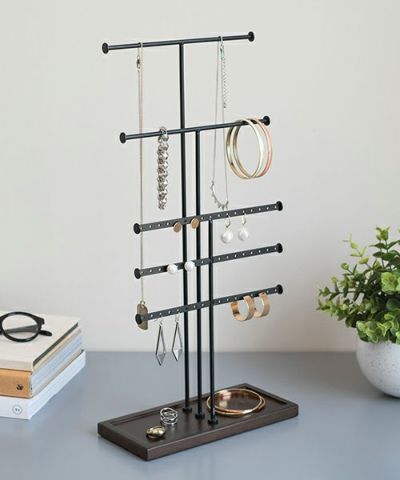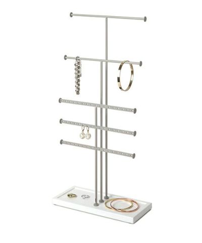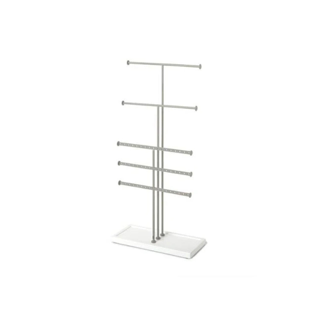 高さの異なるバーが3本あり、様々なサイズのアクセサリーをジュエリーを保管することが出来るアクセサリースタンドです。一番高いバー(48cm)には長いネックレスでも十分にかけておくことが可能です。手前の穴の開いたバーにはイヤリングを引っ掛けて置く事が可能です。5本のバーへは指輪、時計、イヤリング、ネックレス等、様々なジュエリーラックとしてお使いいただけます。ベース自体も小さなアクセサリーのジュエリートレイとしても使用できます。本体下には傷つき防止のためにパッドが敷いてあります。パッドがあることでしっかりと固定されます。