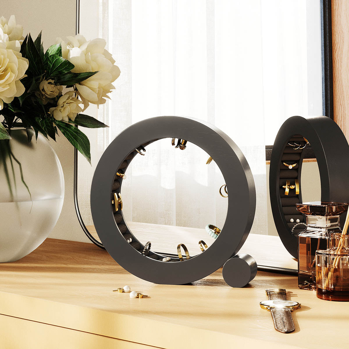 自分へのご褒美やご友人へのギフトに最適で、ベルベットのパッド入りのクッションでリングを挟みんで保護するようにデザインされています。アッシュウッドで作られたFERRIS ジュエリー オーガナイザーは、お手入れが簡単で見た目も印象的です。モダンなデザインは、ご自宅のどんな部屋にもマッチし、ナイトスタンド、ドレッサー、デスクなどに置いても素敵に見えます。リングを着用していないときは、FERRIS ジュエリー オーガナイザーがリングを安全に保管します。サイズの異なる複数のリングやイヤリングに適しているので、スタイルに関係なく、ジュエリーを収納する場所が常に確保しておけます。