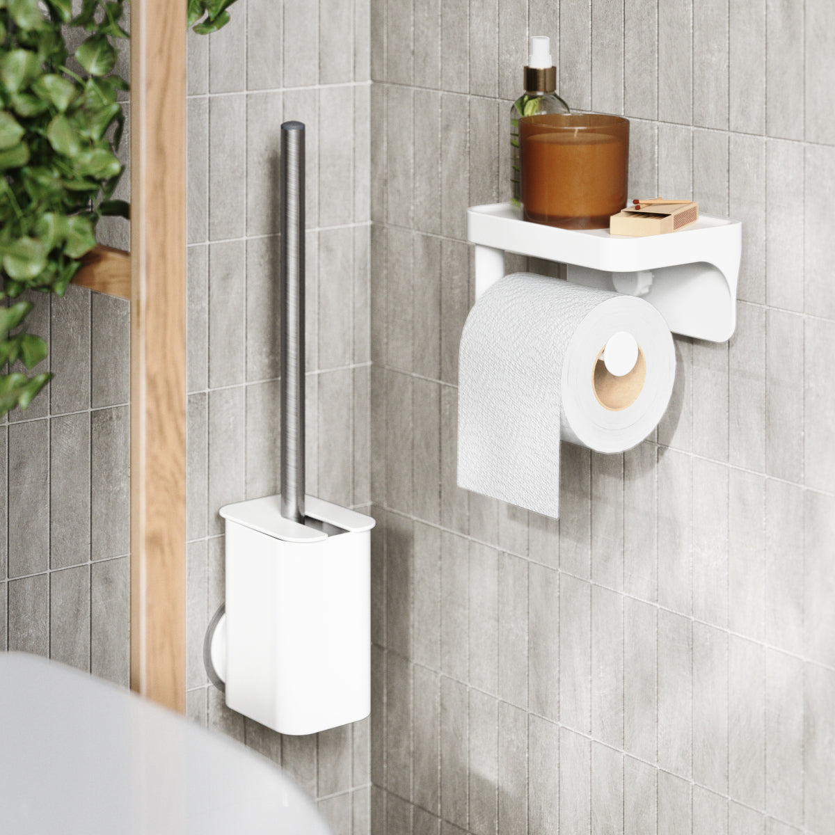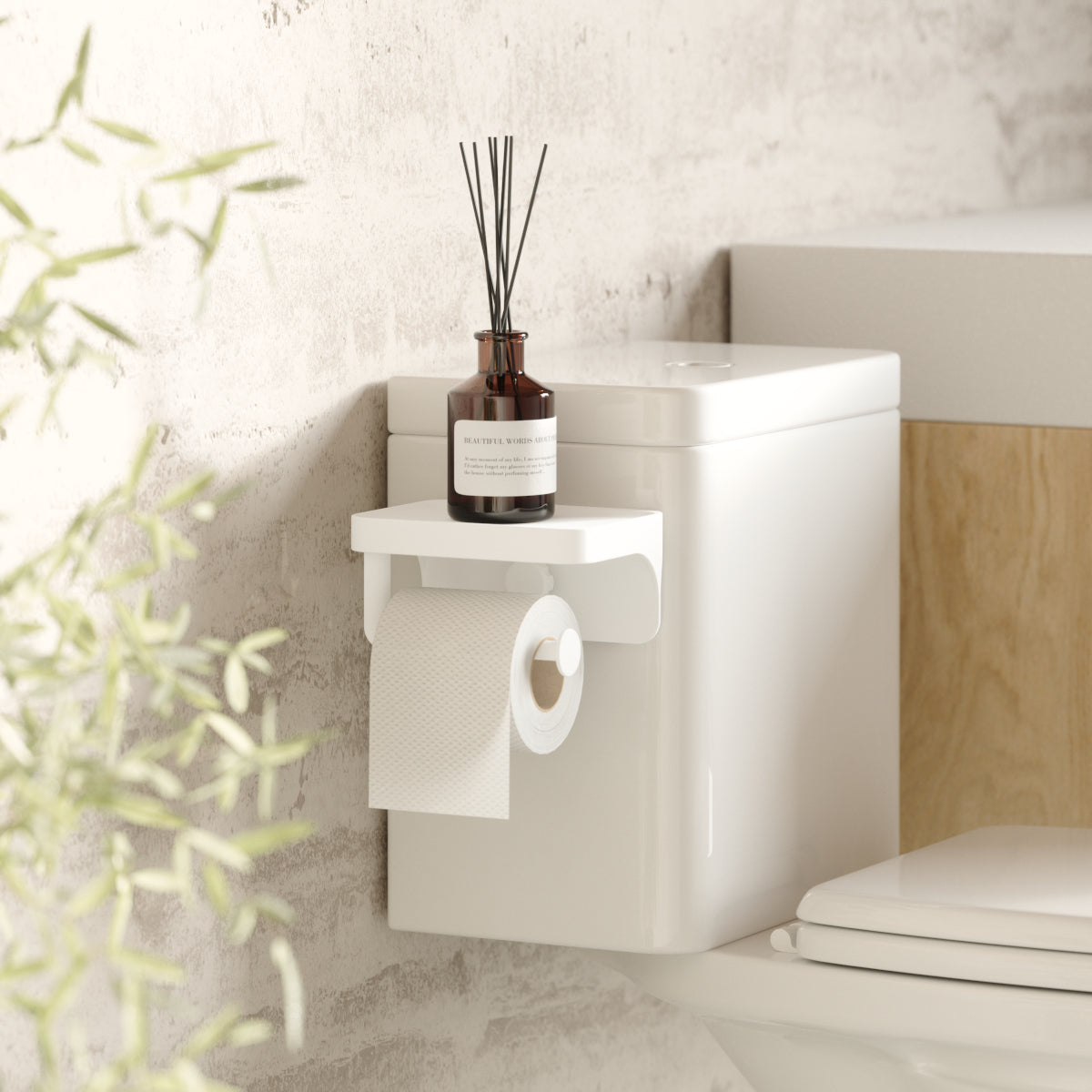トイレットペーパー ホルダーとシェルフが一体になったフレックス アドヒーシブ トイレット ペーパー ホルダー&シェルフは、床のスペースをすっきりさせながら、携帯電話、鍵、その他の小さなアクセサリーを置くのにとても便利です。取り付けが簡単で、ガラス、鏡、タイルまたは大理石、金属、樹脂板などのさまざまな表面に対応している防水の粘着テープが含まれています(多孔質の表面には機能しません)。標準サイズとジャンボサイズのトイレットペーパーロールの両方に対応しています。取り付けには工具も必要なく、取り付ける面を傷つける事もありません。
