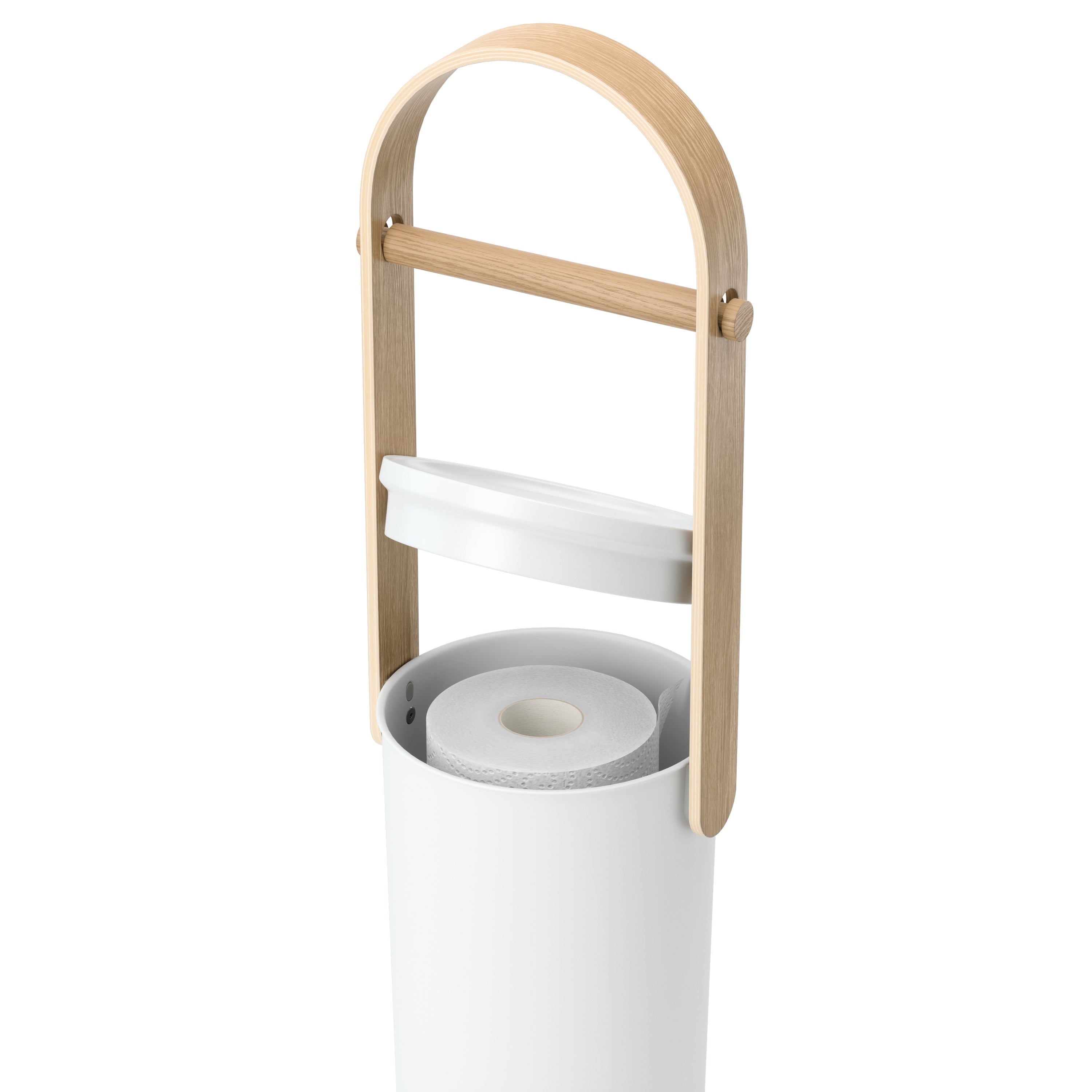 Bellwood トイレットペーパーホルダー&リザーブは、デザイン性と機能性を兼ね備えた構造で、バスルームをより便利で洗練された空間に仕上げます。モダンな雰囲気にぴったりのこの自立型ホルダーは、トイレットペーパーロールを最大3個収納可能。さらに、上部の内蔵トレイにはスマートフォンや鍵、観葉植物、芳香剤などを置くことができ実用性も抜群です。再生可能な木材とリサイクルプラスチックを使用しており、地球環境に優しい持続可能な商品でもあります。軽量で持ち手が付いているので移動が簡単にできて、トイレ内の掃除もしやすく便利なアイテムです。人気なBellwood コレクションの他のアイテムと組み合わせると、統一感のあるインテリアになります。トイレットペーパーストッカー付き。