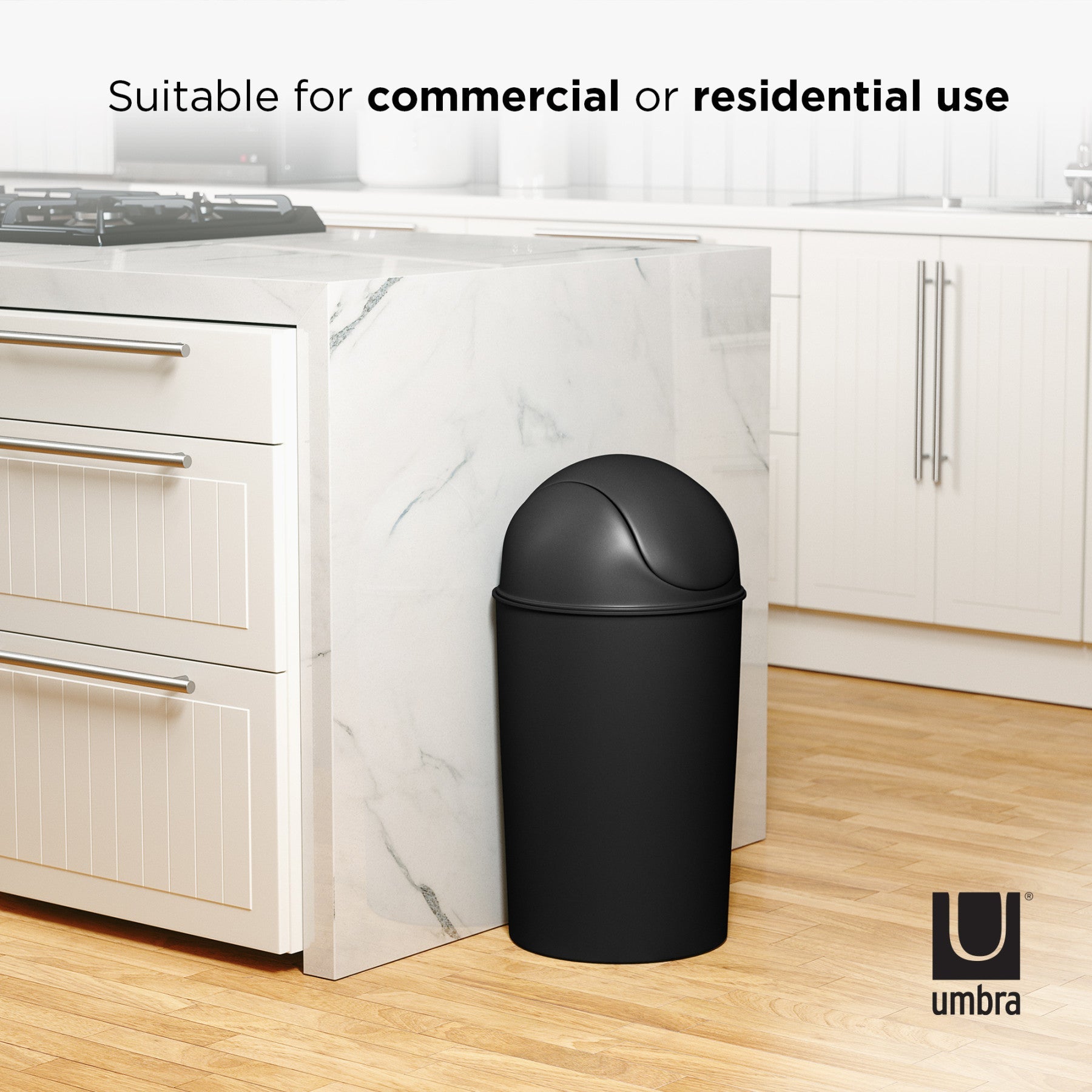 Umbraのグランドカンは39L容量があり、スイングトップの蓋がある黒のごみ箱です。丈夫でお手入れが簡単なポリプロピレンラスチック製です。スイングトップの蓋があることでゴミを目立たないようにし、内蔵のリングでゴミ袋を手軽にセットでき、美しい外観を保つことができます。グランドカンの大きさは直径34cm高さ66cmで、45Lのごみ袋も対応します。お手入れ方法は、石鹸と水または消毒剤で洗い流すか、湿った布で拭いてください。