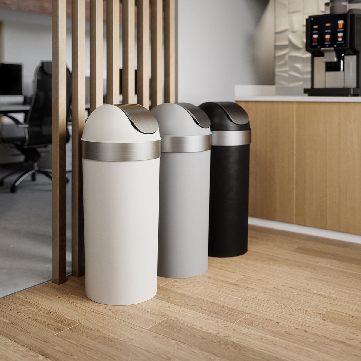 シンプルなフォルムと、回転式のフタが特徴の大容量ゴミ箱。大きな袋どめのリングがついており、袋をしっかりと止め、袋の端の目隠しにもなり、見た目もスタイリッシュに。耐久性のある素材でできており、汚れた時には濡れ布巾で簡単にふき取れ、お手入れに手間がかかりません。ゴミを片手で簡単に捨てられる、回転式のフタを採用。容量は62L。60Lと45Lより大きなゴミ袋を使えるので、ゴミ袋を変える手間が減ります。仕事場、ご家庭などのあらゆる場所でお使いいただけるだけでなく、商業施設においても屋内外問わず、問題なくお使いいただけるほどの耐久性があります。