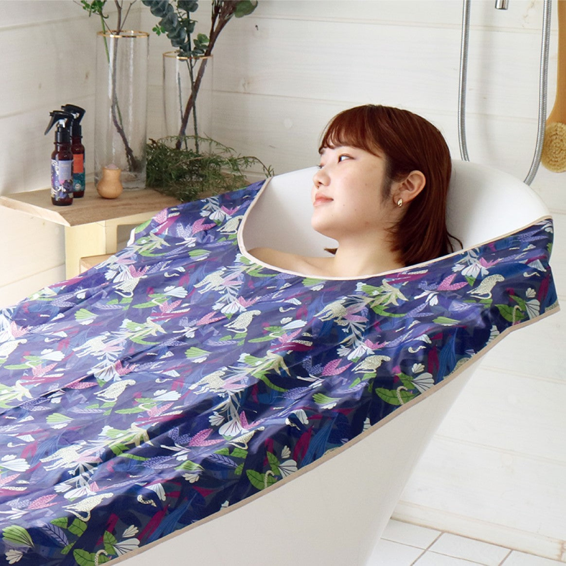 保湿性のあるアルミコーティング生地を使用したお風呂用カバーです。お家でサウナ気分を味わえます。首が出せる形なので、半身浴中でも上半身の冷えをしっかりガード。熱気を逃がしにくい生地なのでより効果的に保温&発汗してくれます。フック吸盤つきなのでバスタブ等の好きな位置で固定でき、使用後は掛けて保管できます。