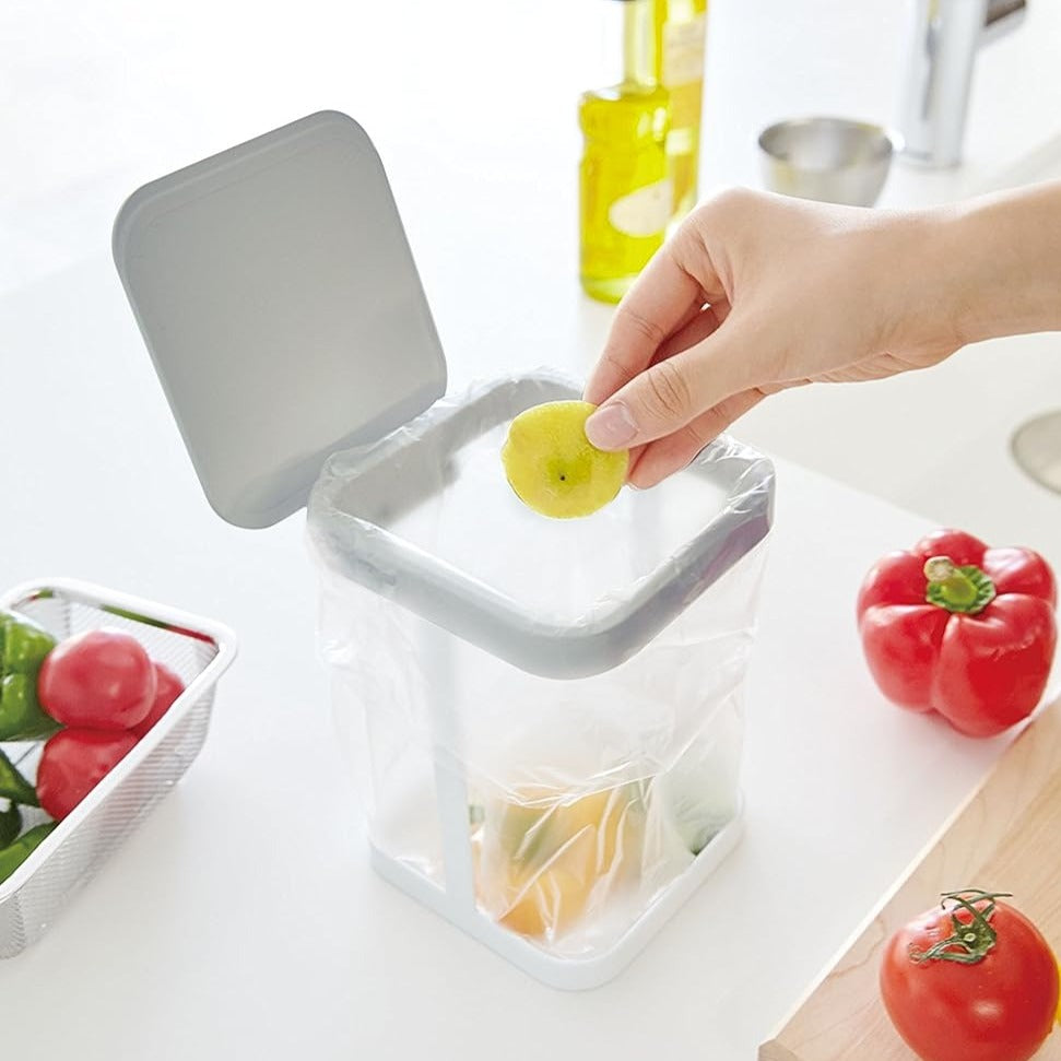 調理中にでるゴミをその場で捨てられる卓上ゴミ箱です。 袋をかけるだけで蓋付きなので、スタイリッシュで衛生的なアイテムです。シンクの中に入れてもすっきりおさまるコンパクトサイズです。