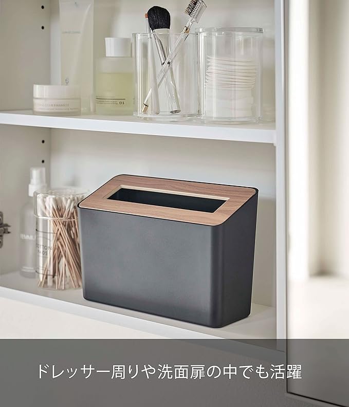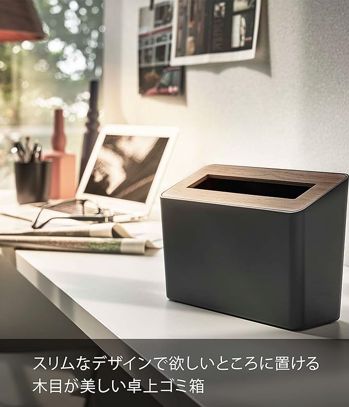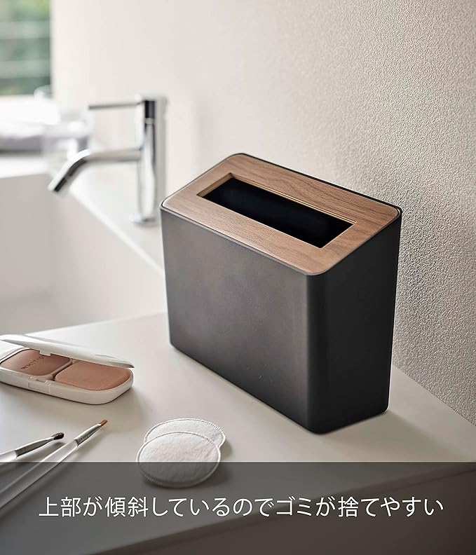 洗面上やデスク上に木目が美しいシンプルな卓上の蓋付きゴミ箱。化粧する際のコットンや綿棒などゴミ箱容器が樹脂だから袋をかけずそのまま捨てられます。スリムだからデスク上においても邪魔になりません。蓋は簡単に脱着可能。蓋の表面は水に強いポリウレタン塗装。