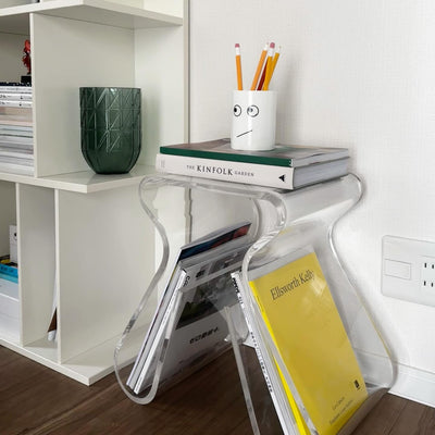 This stool/side table is like an art piece, and its legs double as a magazine rack for storing books and magazines. Its elegant and original form, composed of beautiful curves, exudes presence despite its transparency. It is made of 13mm thick acrylic, making it highly durable. Source: https://www.rakuten.co.jp/