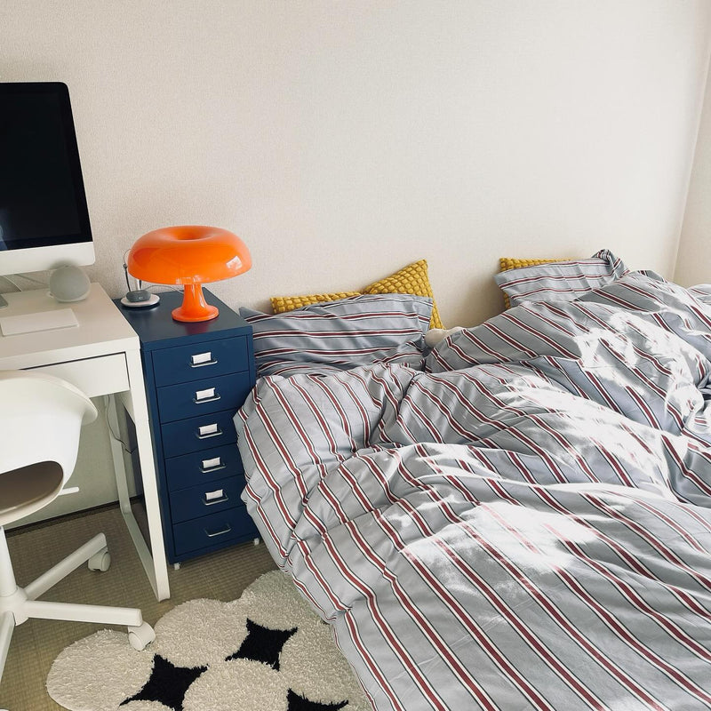 最近ベッドカバーを変えました✌️ シングルとセミダブルをくっつけたら広々でいい感じです〜