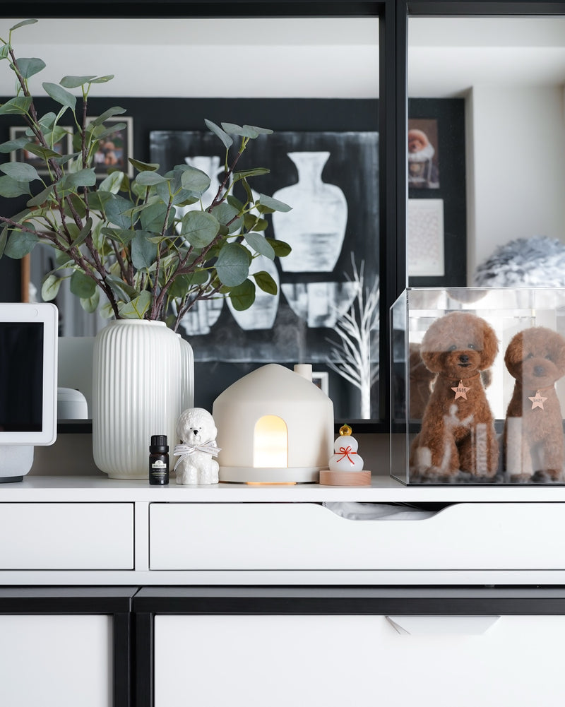 クリスマスが終わって、おうちみたいなアロマディフューザーの周りに飾っていた木々🌲を片付けて番犬だけになったので、小さいガラスの鏡餅を置いてみました。