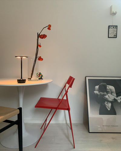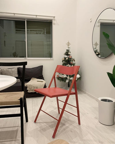 This folding chair is just 3cm thick when folded. It is a Scandinavian-inspired item available in a wide range of colors. It is about the same thickness as a cigarette case, so it can be stored in a very small space. The backrest is curved to fit your back, and the seat is slightly concave to follow the hip line. Source: https://www.rakuten.co.jp/