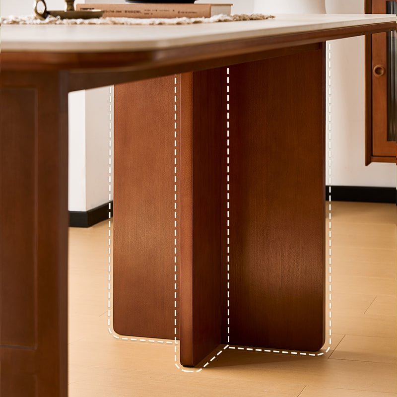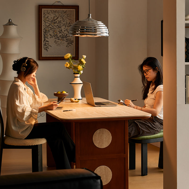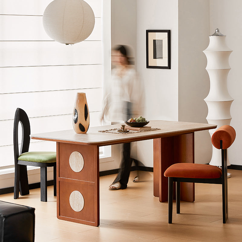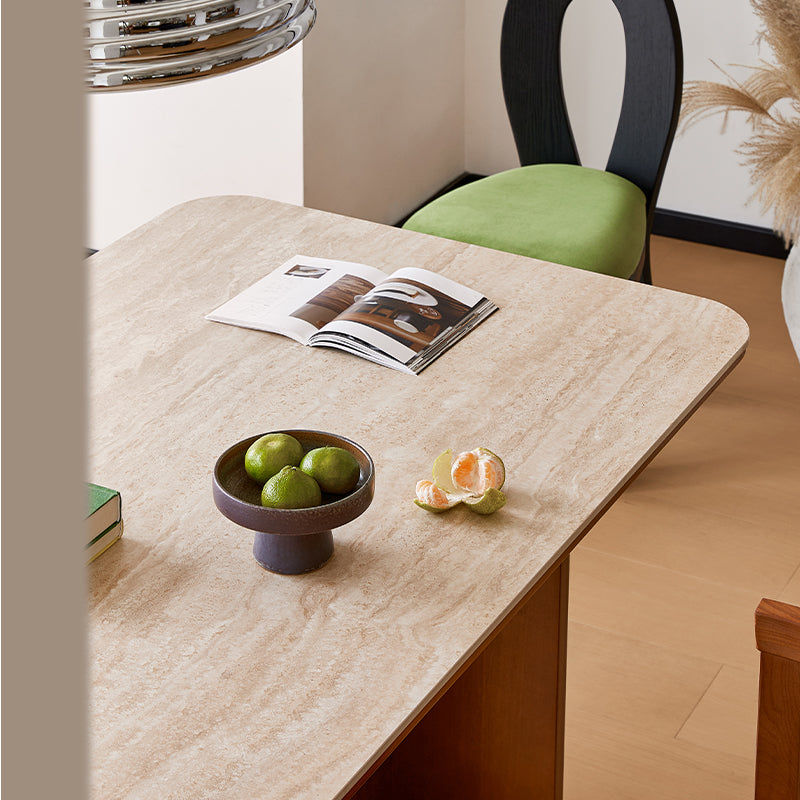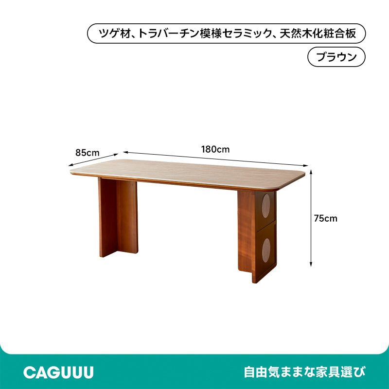 This wide dining table made of boxwood features a natural and modern design. It belongs to the high-quality wood series and has an attractive travertine-like ceramic top. It is highly durable, scratch-resistant, wear-resistant, and heat-resistant to 2000°C. Its waterproof and antibacterial properties make it easy to keep clean, making it ideal for family and couple dining. Source: https://caguuu.com/
