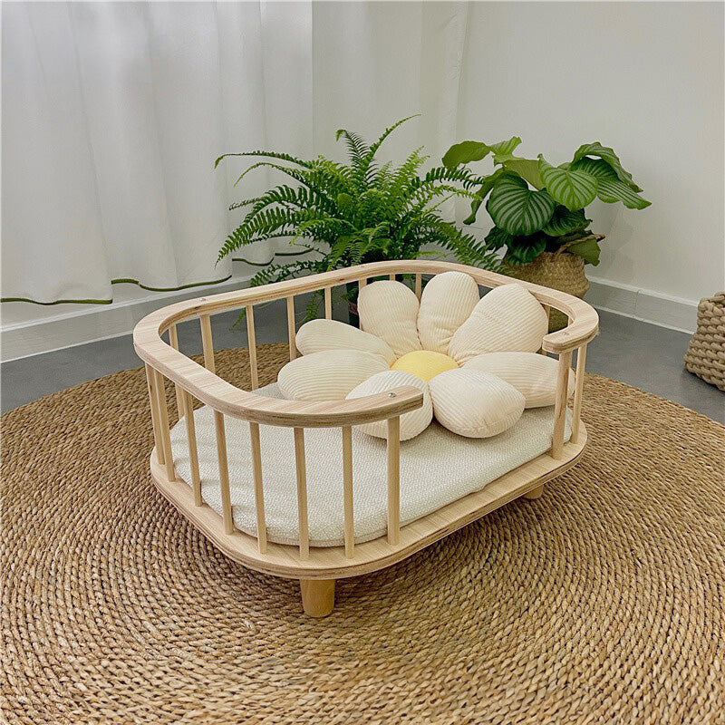 The wooden lattice pet bed provides your pet with a comfortable and stylish resting place. Made of natural wood, it features a simple and beautiful design. Made of high-quality plywood and linen cushion, it is durable and comfortable. Lightweight design makes it easy to carry. Comes with a flower-shaped cushion to provide extra comfort for your pet. It matches your interior decor and is an ideal resting place for your pet. Source: https://caguuu.com/