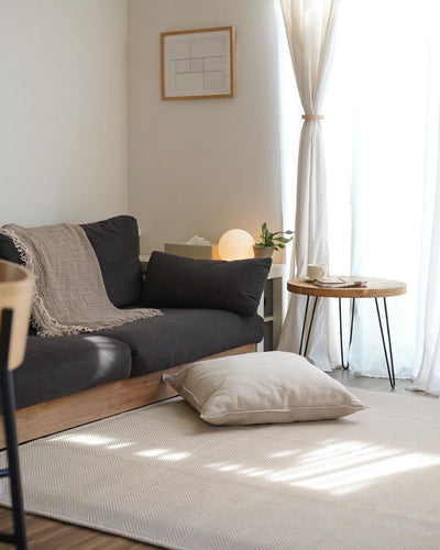 This is a lovely herringbone pattern rug that matches Scandinavian design furniture. White threads are woven horizontally and mixed with threads of the same color vertically to create a three-dimensional herringbone pattern. The pattern is clearly visible because it is roughly woven. The herringbone pattern is finished with a thick pitch, so it looks like a border pattern when viewed from a distance. It is smooth, yet soft and gentle to the touch. Source: https://www.rakuten.co.jp/