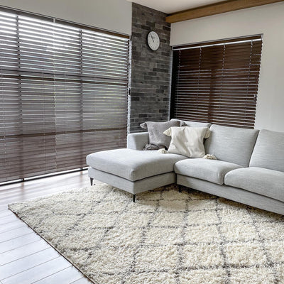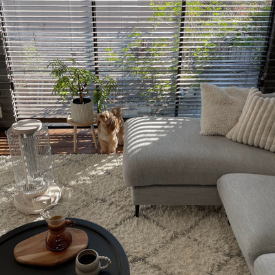 You'll fall in love at first sight with this Beni O'Ourain-style rug. Available in two colors: pale ivory x light gray and cool ivory x gray. Perfect as an accent for a modern room, such as a Moroccan or West Coast style. Not only is the design appealing, but the long pile is soft and comfortable, making you want to lie down on the rug. Source: https://www.rakuten.co.jp/