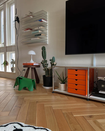 This storage accessory is the perfect size for USM Haller units. Its five drawers can hold small stationery items as well as A4-sized documents such as clear files. It helps keep any space, from the home office to the workplace, organized. Three of them can be placed side by side in the W750 open unit. Source: https://online.actus-interior.com/