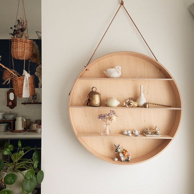 This circular wall-mounted display shelf allows you to display your favorite objects, dolls, and more, however you like. By matching the color tones of your ornaments, even a large number of items will appear cohesive and neat. It's also a great idea to decorate with different themes for different seasons, such as Christmas and Halloween. The shelf itself and the wall-mounting hook are made of beech and birch wood, and the hanging string is made of leather. You can adjust the length of the string by tying it. The warm, gentle colors of natural materials make it suitable for any location, such as the living room, entryway, or children's room. Source: https://online.actus-interior.com/