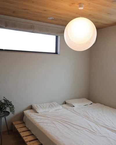 The MAYUHANA pendant light beautifully reflects and transmits light through its three-layered shade. The layers of light create a softer, gentler glow that fills the room. The MAYUHANA series, with its delicate, cocoon-like form, is crafted from fiberglass and transparent resin, spun like thread. Light emitted from the central lamp repeatedly reflects and transmits through the shade, capturing surrounding light and enhancing its brilliance. The shade's density has been carefully calculated to minimize glare, even when looking directly at the center of the light in a dark room. As the designer describes it, "neither Western nor Eastern, both geometric and non-geometric," this unconventional design is suitable for a variety of uses, from living rooms and dining rooms to bedrooms, entryways, hallways, and public spaces. Available in a wide variety of styles, including floor-mounted, stand-alone, and pendant lamps, it also functions as an art object when turned off. Source: https://www.rakuten.co.jp/