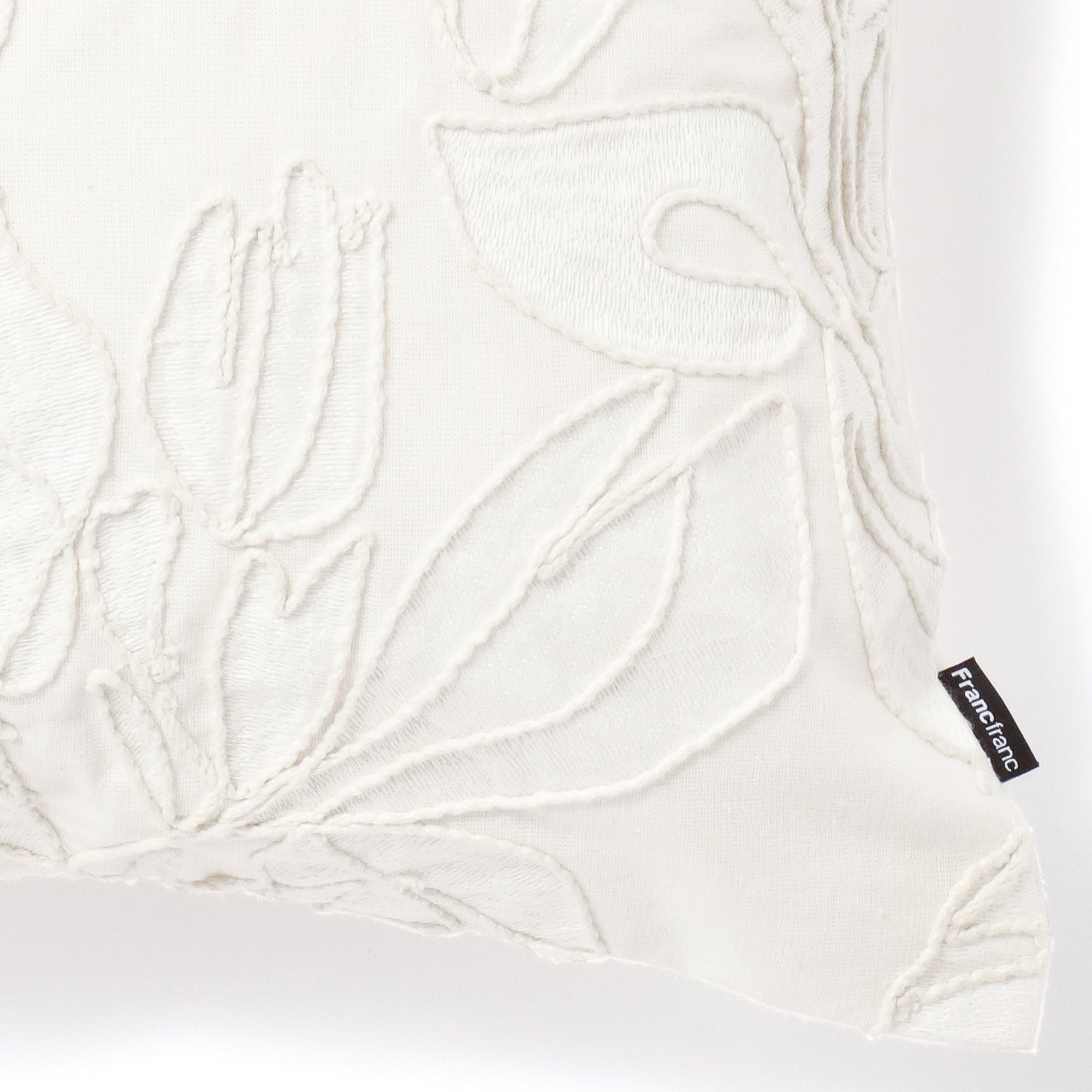 This is an elegant cushion cover with a cotton-linen fabric and floral embroidery with a textured feel. ▼Click here for cushion cover filling (sold separately)Cushion nude listSizeW450×D450×H10mmMaterialBody: 90% cotton, 10% linen, embroidery: 100% polyesterWeight0.17 kgColorWHProduct number1102010049136The price is 550 yen (tax included) nationwide. If the total amount of miscellaneous goods is 5,000 yen (tax included) or more, we will deliver it free of charge. *Handling fees, wrapping fees, and additional service fees are not included. *During the new life period and the year-end and New Year holidays, it is a busy period for shipping and delivery, so even if you specify a date and time, we may not be able to deliver it on the desired date and time. ■Washing: Hand wash only■Machine wash: Not allowed■Dry cleaning: Not allowed■Tumble drying: Not allowed■Ironing: Allowed■Water repellent treatment: Not allowed■When cleaning, to avoid changes in appearance, please wash by hand gently by pressing it alone instead of using the hand wash cycle in the washing machine. ■Please avoid rubbing. ■The edges of the embroidery may come undone when washed. ■Washing with water will cause it to shrink. ■Adjust the shape and dry in the shade. ■Due to the nature of the material, friction and hand washing may cause pilling, shedding, and fuzzing. Source: https://francfranc.com/