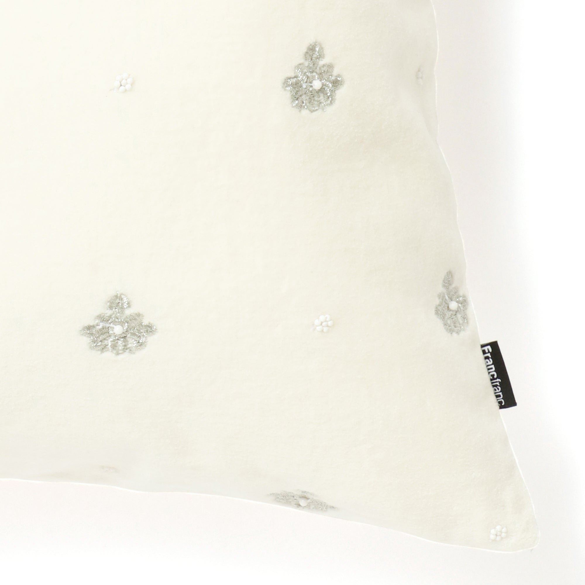 This elegant cushion cover features silver thread embroidery on a white velvet fabric. ▼Click here for cushion cover fillings (sold separately)Cushion nude listSizeW450×D450mmMaterialFront: 100% cotton, plastic beads used, embroidery: 100% polyester, back: 100% cottonWeight0.15 kgColorWHProduct number1102010049556The shipping fee is 550 yen (tax included) nationwide. If the total amount of miscellaneous goods is 5,000 yen (tax included) or more, shipping will be free. *Handling fees, wrapping fees, and additional service fees are not included. *During the new life period and the year-end and New Year holidays, shipping and delivery are busy periods, so we may not be able to deliver on the desired date and time even if you specify a date and time. ■Washing: Not possible■Dry cleaning: Not possible■Tumble drying: Not possible■Ironing: Not possible■Water repellent treatment: Not possible■This product uses many decorations. ■Decorations may break or come off. ■Please be careful not to get them caught on clothes or furniture. ■Because of the three-dimensional and rough decoration, please be careful of strong friction against the skin. ■Due to the nature of the product, it cannot be washed with water or dry cleaned. If it gets dirty, wipe it lightly with a tightly wrung cloth. ■Use and friction may cause pilling, shedding, and pilling. ■Country of origin: India Source: https://francfranc.com/