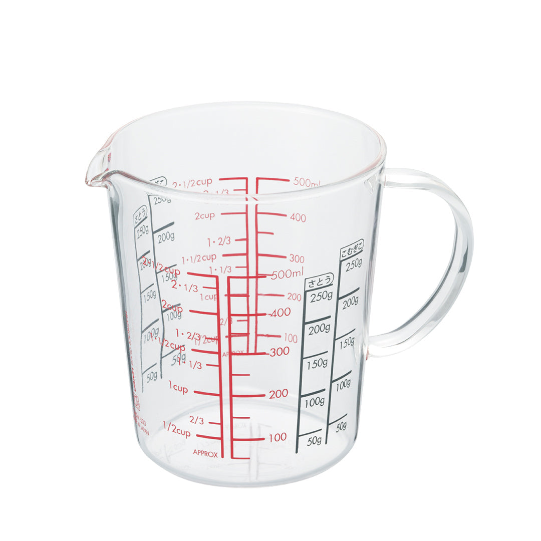 The scale can be read from the inside. The scale is easy to read, with black for powders and red for liquids. It also comes with a handle. Source: https://shop.hariocorp.co.jp/
