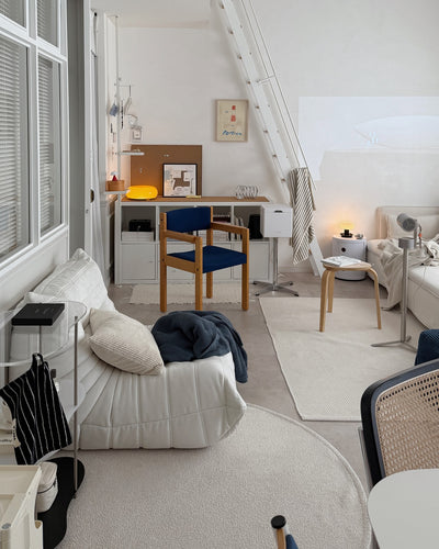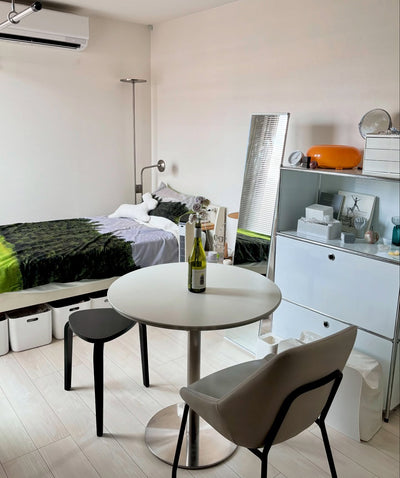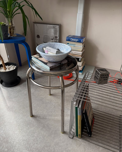 A stackable stool with three legs. The bent legs and triangular seat make a nice, subtle accent. It can be used as an extra seat for guests or as a place to put cups etc. Source: https://www.ikea.com
