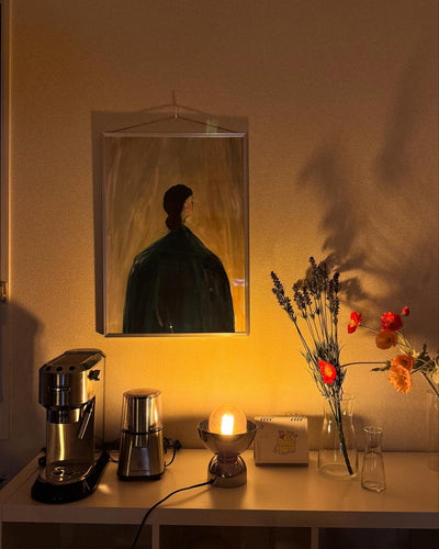 A rounded metal table lamp with a decorative LED bulb with a spiral filament that emits soft light through smoked glass, creating a cosy atmosphere in the room. Source: https://www.ikea.com/jp/ja/