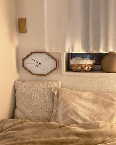 This wall clock features a long horizontal octagonal shape. The gold parts on the dial add an elegant accent. The numbers are made as small as possible to give it a smart impression. The design is simple yet unique, and we value a sense of playfulness. Source: https://www.amazon.co.jp/