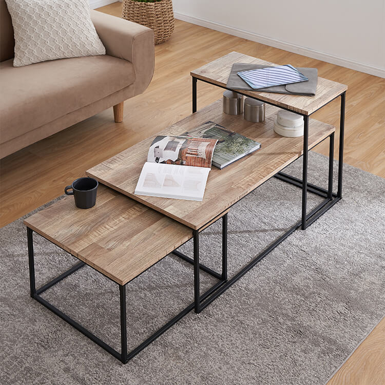 A 3-piece nesting table that can be transformed into a coffee table or a desk for PC work by simply rearranging it. It is a table that can be used in multiple ways and makes effective use of space. A stylish combination of a sophisticated wood grain and delicate steel legs. Just place it in your living room or bedroom and it will stylishly upgrade your usual space. This nesting table consists of three tables of different heights. It can be used not only as a center table or side table, but also as a single item for various uses according to the scene. A nesting table is a table that can be stored by combining tables of different sizes with the same design like "nesting". Its functional and beautiful design allows you to expand or shrink the space depending on the purpose. Source: https://www.low-ya.com