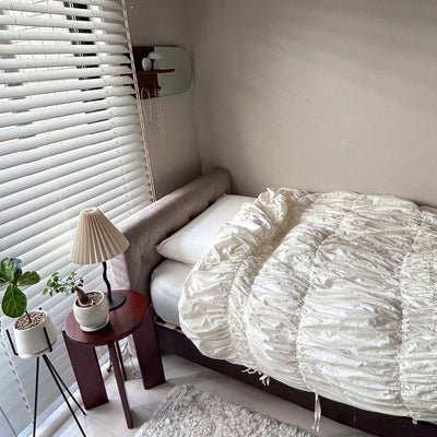 Just by placing this bed frame in your room, you can make your room a thrilling one. The contrasting materials of the velvet-like and gold legs create a luxurious and elegant space. This elegant bed frame will be the centerpiece of your bedroom, and while it takes advantage of its beautiful silhouette, it is designed to suit modern Japanese homes. Source: https://www.low-ya.com