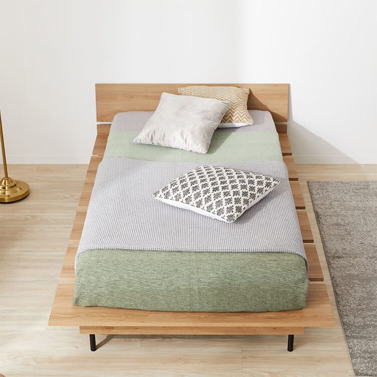 This low bed frame combines wood grain and steel to match any room style. The two different materials create a calm atmosphere, making the space even more stylish and comfortable. Even in bedrooms that tend to have a narrow and cramped impression, lowering the height of the bed can make the ceiling appear higher and create a spacious space. Source: https://www.low-ya.com