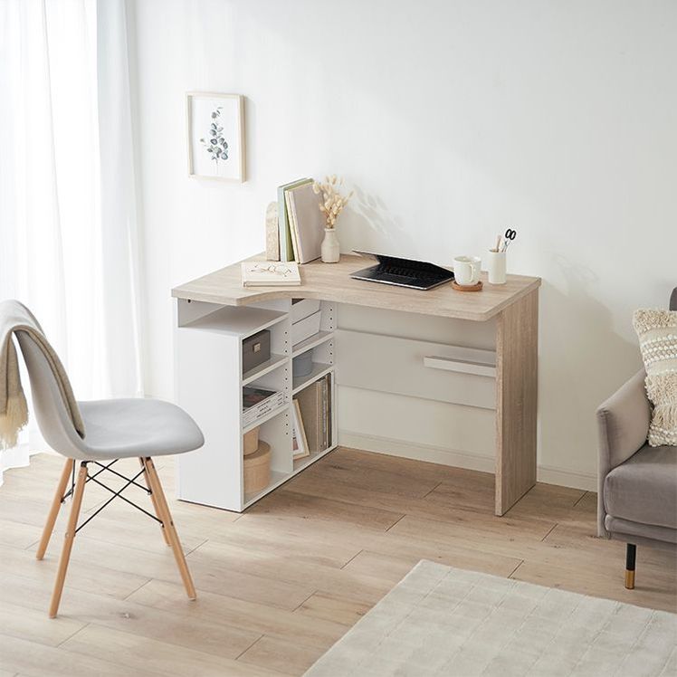 This L-shaped computer desk features a natural woodgrain design. It is compact yet has a large work space, so it fits perfectly in a small room. There is a movable storage shelf on the left and a space for a laptop, so it is recommended for those who have a lot of documents and storage items. Source: https://www.low-ya.com