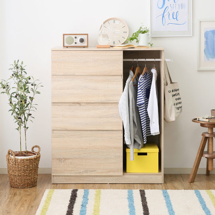A convenient chest that combines a dresser and a closet. By storing your jackets and bags, you can always tidy up your room easily and stylishly. Clothes, hats, and bags keep piling up. You want to tidy them all up at once, but you don't have much space... This one item will solve all those problems for those living alone or in a one-room apartment. The simple "flat design" without handles creates a neat and tidy room. For those who want both functionality and design. You can choose the color to match the taste of your room. Source: https://www.low-ya.com