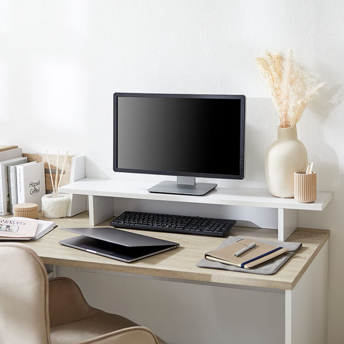 An L-shaped desk with stand that pursues design, functionality, and work efficiency. "Keep what you need within reach." This efficient style is realized. This set includes a user-friendly L-shaped desk and an "upper shelf" and "book stand" that can be used as a bookshelf or monitor stand. The slouching posture seen when working on a computer... We have prepared an "upper shelf" and "book stand" that can raise the height of the monitor to properly support the posture that tends to become hunched. When not using it as a monitor stand, it can also be used as a bookshelf! You can easily add storage space on the top board or at the base. Source: https://www.low-ya.com
