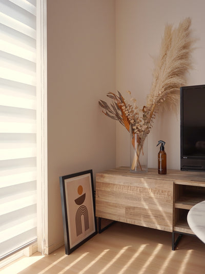 This TV stand combines solid wood-like 3D paper with thin steel legs, focusing on design and functionality. The realistic wood grain gives it a luxurious feel and design, reminiscent of Japanese furniture. Source: https://www.low-ya.com