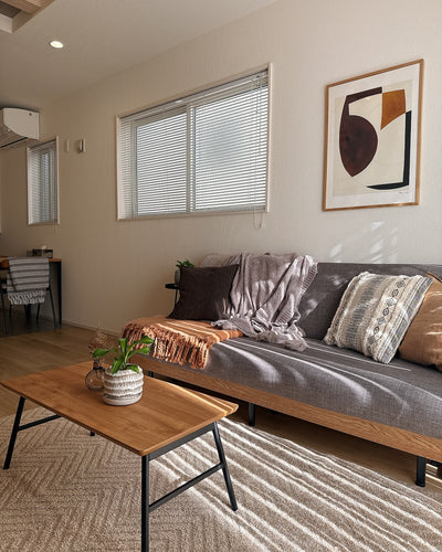 This sofa features a vintage-style side frame with beautiful wood grain. The beautiful wood grain that stands out against the simple form brightens up the room. The large knots and rough wood grain are left in their natural state. Source: https://www.rakuten.co.jp/