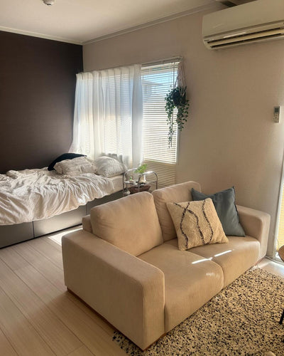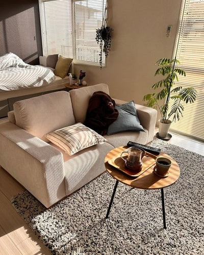 This fabric sofa has a warm feel, with solid wood legs blending into the corduroy fabric. It is perfect for a vintage look. The corduroy becomes softer and more textured with use. Source: https://www.modern-deco.jp/