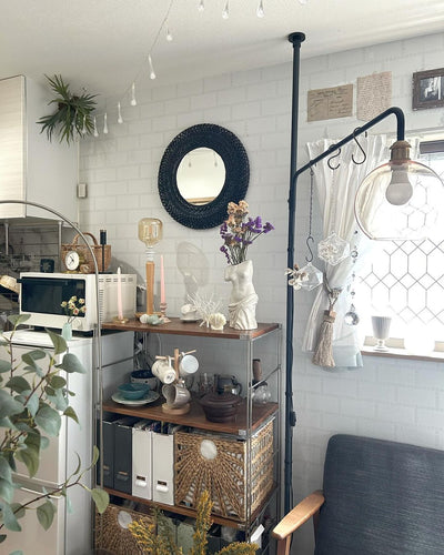 This open shelf combines stainless steel and oak. Because it is a modular system, you can change the optional parts such as scallops, shelves, and wardrobe bars to suit your lifestyle and preferences. Source: https://www.muji.com/