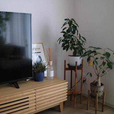 This TV stand can accommodate even large TVs. The overall height is kept low, so it doesn't feel oppressive to the surroundings and makes the space look larger. The two storage spaces allow you to store DVDs, AV equipment, etc. Source: https://www.rakuten.co.jp/