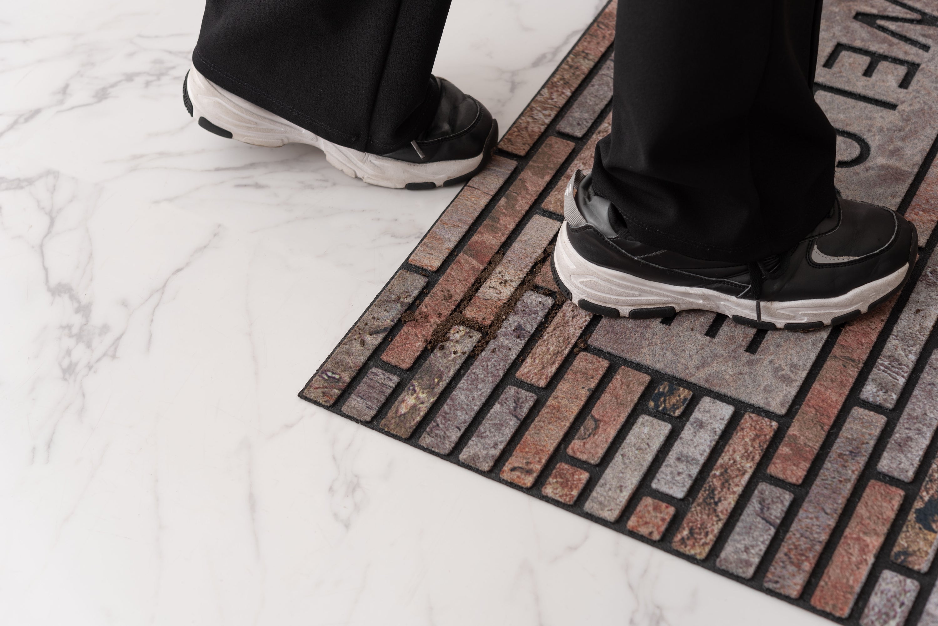 A new design has been released for the popular door mat that removes dirt and dust from your feet and allows you to enjoy your interior. The mat's firm weight prevents it from slipping, and it can be washed with water, so you can keep it clean at all times. The eye-catching design will accentuate your entrance.