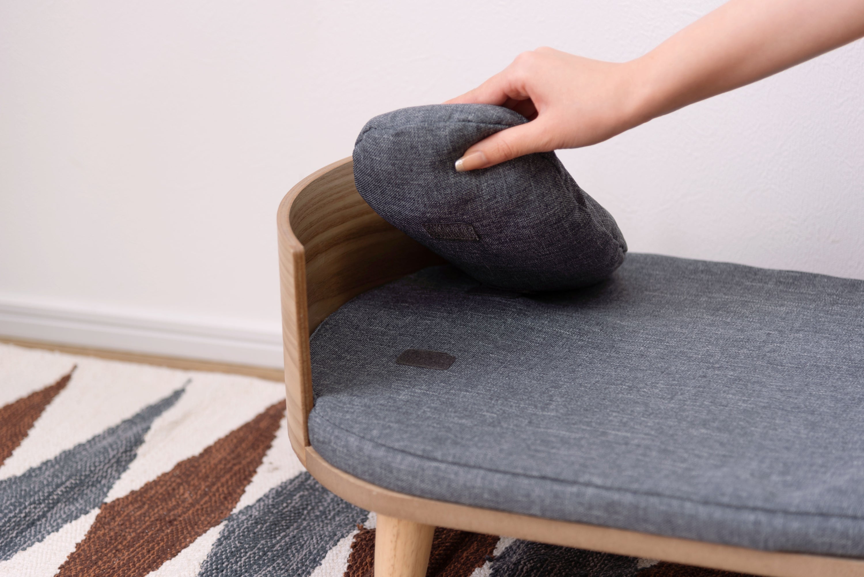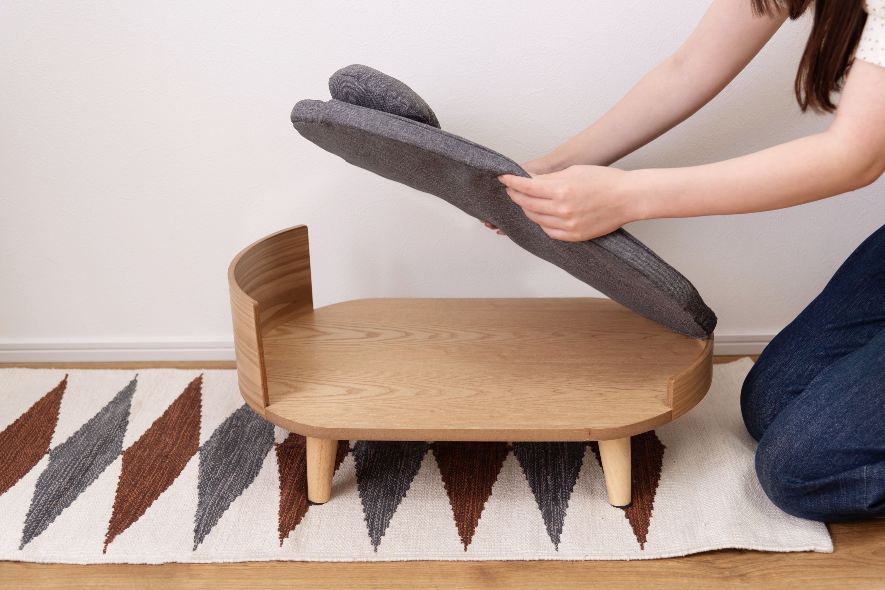 A pet bed with a cute curved shape that blends in with any interior. The legs are made of natural rubberwood, and the frame is made of natural ash (veneer). It also comes with a pillow, so it's designed to look like a real bed. The dedicated mattress is a cover type, so you can wash it by hand and keep it clean (the pillow is not a cover type). It is easy to assemble with no tools required, just screw in the legs, so you can use it from the day it arrives.