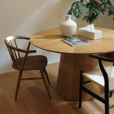 This round dining table will add a stylish touch to your dining table. Its beautiful circular shape looks great from any angle. The grain of the wood and the stylish herringbone design give you the warmth and superiority of wood. Source: https://www.amazon.co.jp/