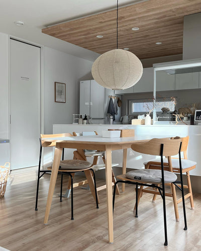 This semi-custom dining table is available in four different tabletop sizes, five different leg types, and two different wood types. It has a basic, heavy design that goes well with any chair. The wooden parts on the legs add an accent. Source: https://www.rakuten.co.jp/