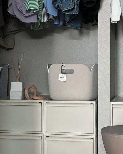 This is a high-quality basket that goes beyond the quality of recycled products. It features a soft felt texture and a round, plump shape. Although it may look soft at first glance, the inside of the felt is made from recycled PET bottles, making it hard and durable. Source: https://www.sempre.jp/