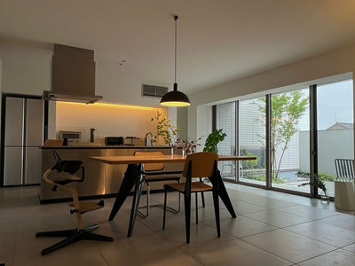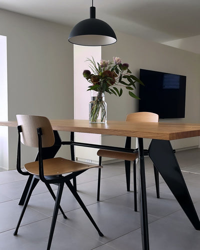 The Standard chair, designed by Jean Prouvé, is one of the most famous classic chairs. Prouvé, a French designer, architect, and engineer, recognized the true essence of chairs: when sitting, the rear legs bear the greatest strain, and he applied this insight to the design of the Standard chair. The front legs, which bear a relatively light weight, are made of thin steel tubes, while the rear legs, which bear a heavier weight, are made of thick, hollow steel plates, allowing the weight of the chair to escape to the floor. Source: https://www.sempre.jp/