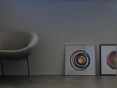 This poster is from "fifteen variations on a single theme" designed by Max Bill. It is one of the concrete art pieces "15 variations on a single theme" that develops 15 variations based on the keywords "continuity," "development," and "idea" based on one original design. The variations are developed through a mathematical interpretation with rules, eliminating subjective elements. "Variation 1" connects the spiral shape of the original design with points and constructs it as a polygonal surface using only straight lines. The overlapping polygons are colored in six colors: yellow, red, green, blue, orange, and purple. "Variation 12" connects the points with curves and develops it into a circle. It is constructed according to the rule that the overlapping parts of the surface are filled with black, so it looks like large and small rings are folded three-dimensionally. You can choose from four simple frames and we will deliver it to you in a set, so you can display it in your room right away. Source: https://www.truss.jp/