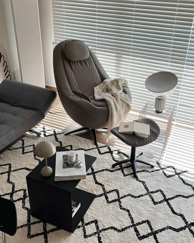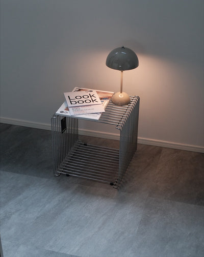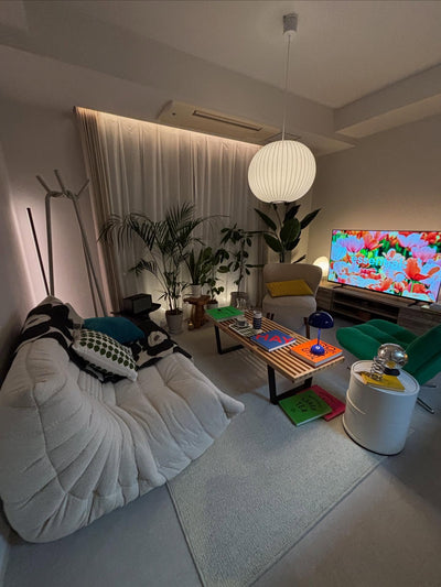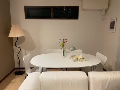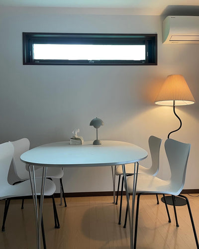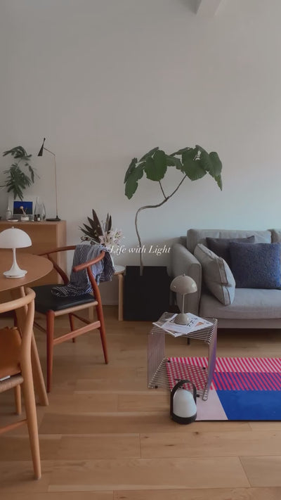 The Flower Pot, characterized by its dome-shaped upper shade and the rounded lower shade that hangs from it, embodies Verner Panton's adventurous attitude in constantly pursuing new designs. The portable lamp "VP9" is slightly smaller than the Flower Pot table lamp and intentionally lightweight, powered by a USB charging cable. Because it is rechargeable, it can be used both indoors and outdoors. The switch on the top of the shade allows for three levels of dimming. Unlike the traditional Flower Pot design, the portable version emits a glare-free light from below the upper shade. Source: https://www.truss.jp/