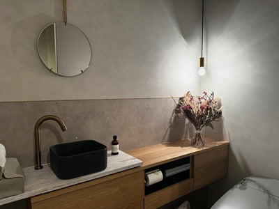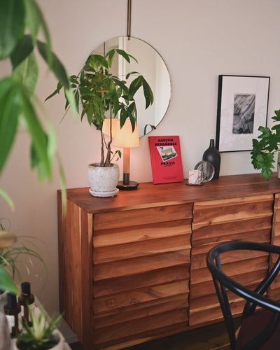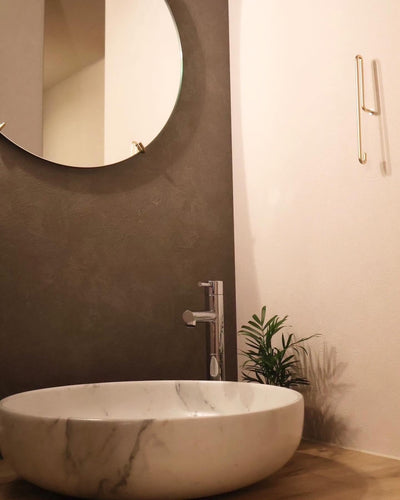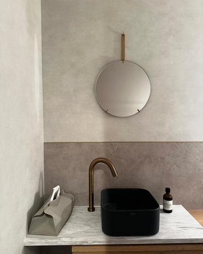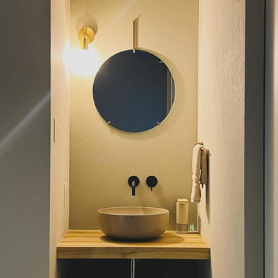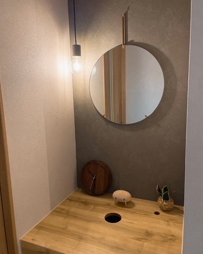 This is a frameless wall mirror supported only by a lightweight wire. The simple design blends into any room and makes a beautiful interior piece. Available in two colors: black and brass. Source: https://www.wallyouneed.jp/