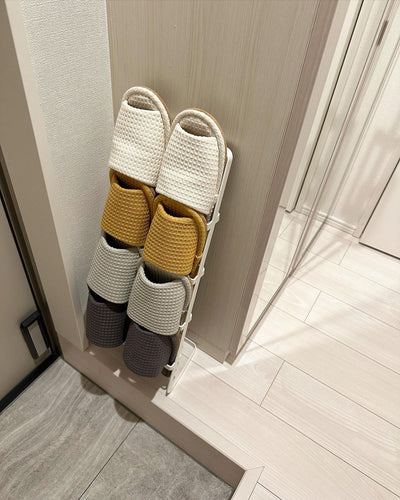 Slim slipper stand. A simple design slipper stand that is compact yet functional. The vertical design allows you to store your slippers neatly without taking up space, such as next to the shoe cupboard at the entrance, in the hallway, or in the living room. Source: https://www.amazon.co.jp/