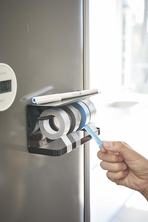 Masking tape and pens, which are often used for labeling, can be stored together next to the refrigerator. Rubber bands can also be stored in the hook section. Just attach it to the refrigerator with a magnet. It comes with a blade so you can cut it and use it as is. Source: https://www.amazon.co.jp/