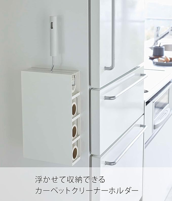 Simply attach it to your refrigerator or washing machine with the powerful magnet. A floating carpet cleaner stand. Can also be attached to the wall with the included wood screws. Source: https://www.amazon.co.jp/
