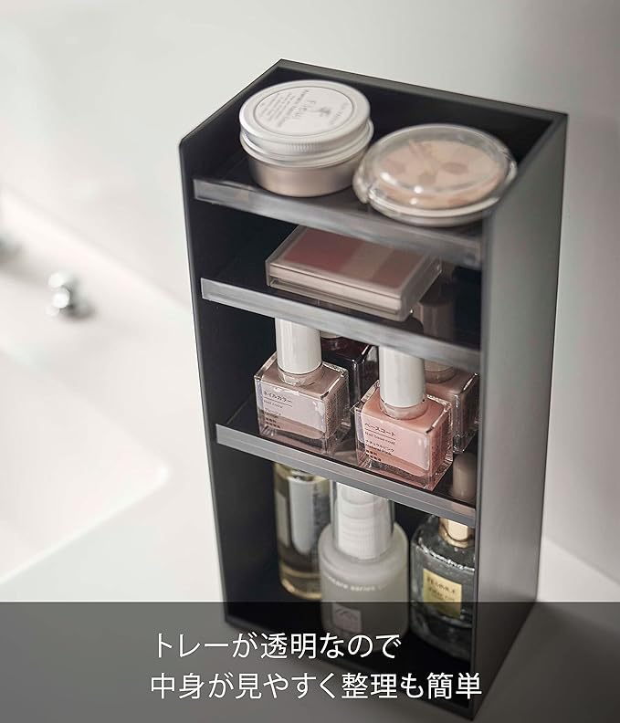 Store cosmetics and small items together in one place. The tray is transparent, so you can easily see the contents, and the height of the cosmetic storage case can be adjusted. Source: https://www.amazon.co.jp/
